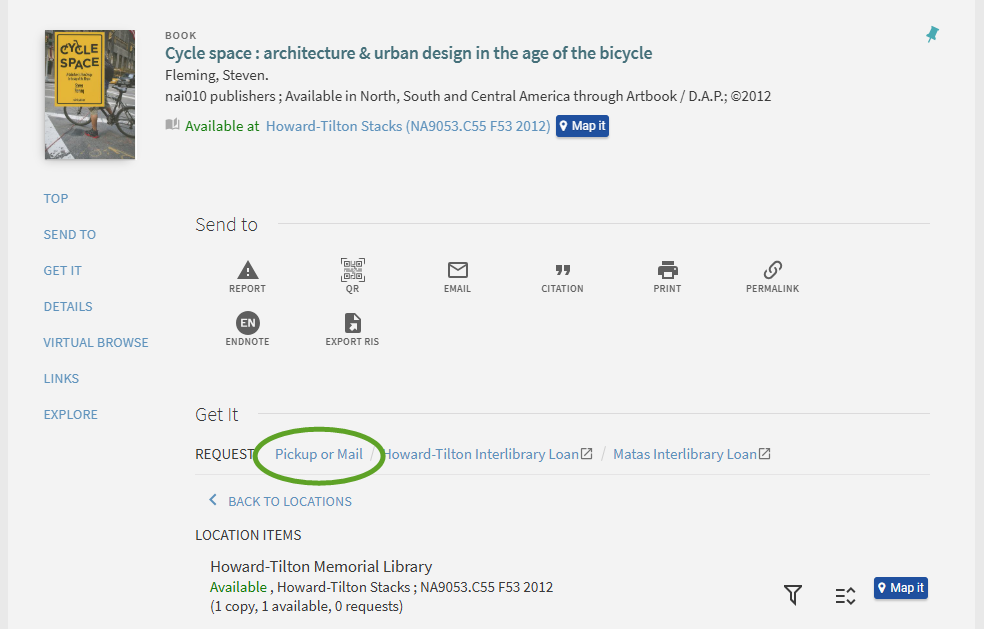 3. Click on "Pickup or Mail." If you do not see the Pickup or Mail option, you may have a block due to fees or due to the need to register for classes. Email circ@tulane.edu or call (504) 865-5689 for assistance.