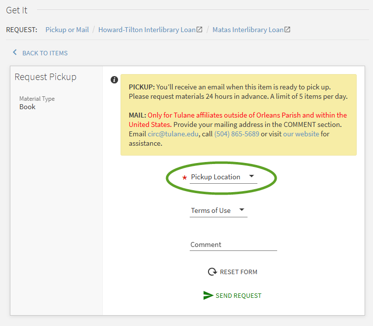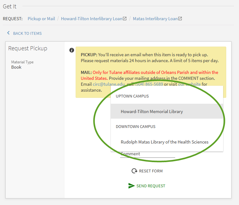 5. Choose a pickup location. (Howard-Tilton, Matas). To request an item to be mailed, write a note in the COMMENT section and provide your mailing address. Email circ@tulane.edu or call (504) 865-5689 for assistance.