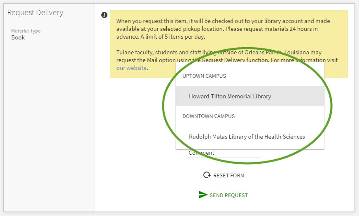 5. Choose a pickup location (Howard-Tilton or Matas). To request an item to be mailed, write a note in the Comment section and provide your mailing address.