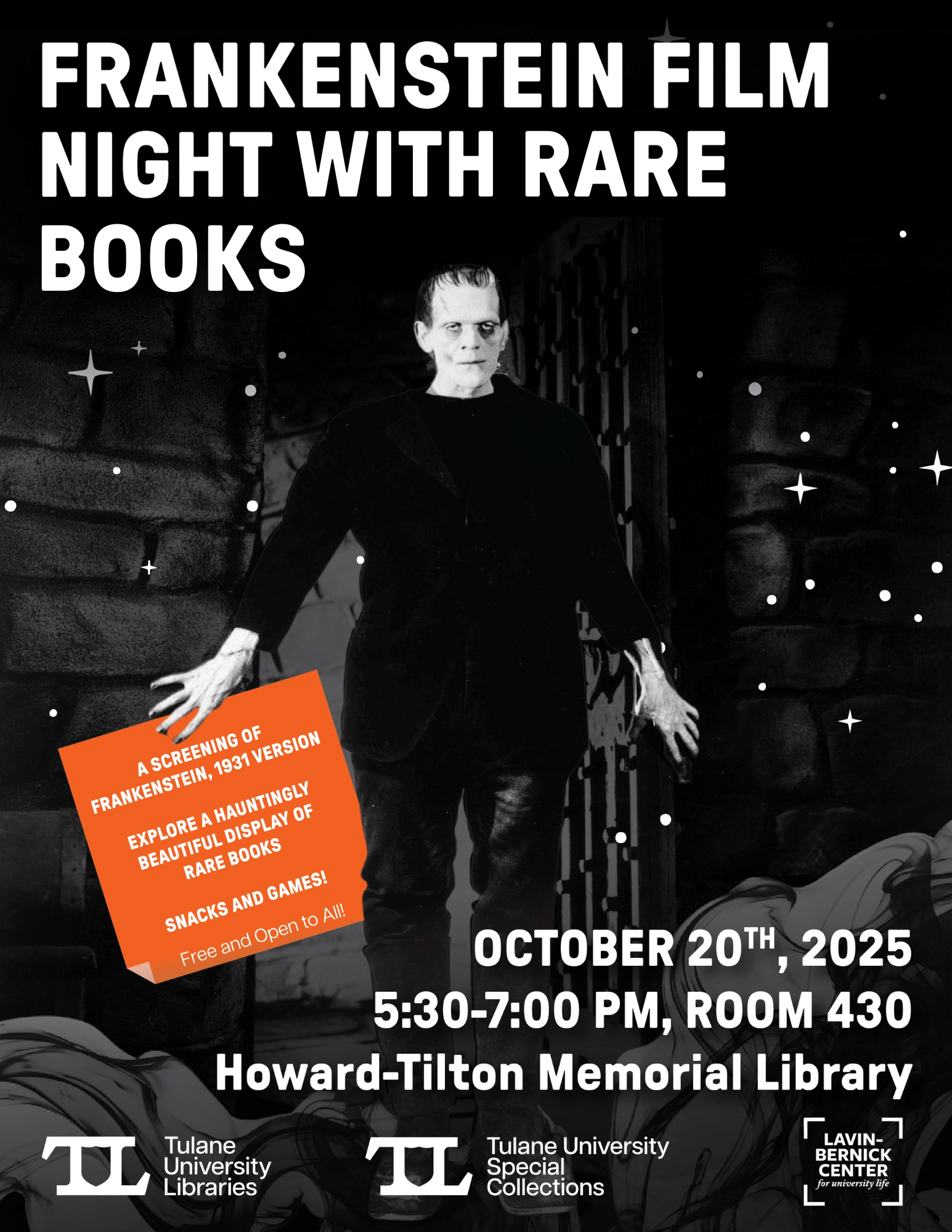 Sweet treats, monstrous books, and, of course, Frankenstein! Join Tulane University Libraries and Lavin-Bernick Center for University Life for this one-of-a-kind event. Come early at 5:30 to explore monstrous mysteries from the Rare Book Collections, then settle in for sweet treats and popcorn and a screening of movie that defined a genre: James Whale's 1931 Frankenstein.